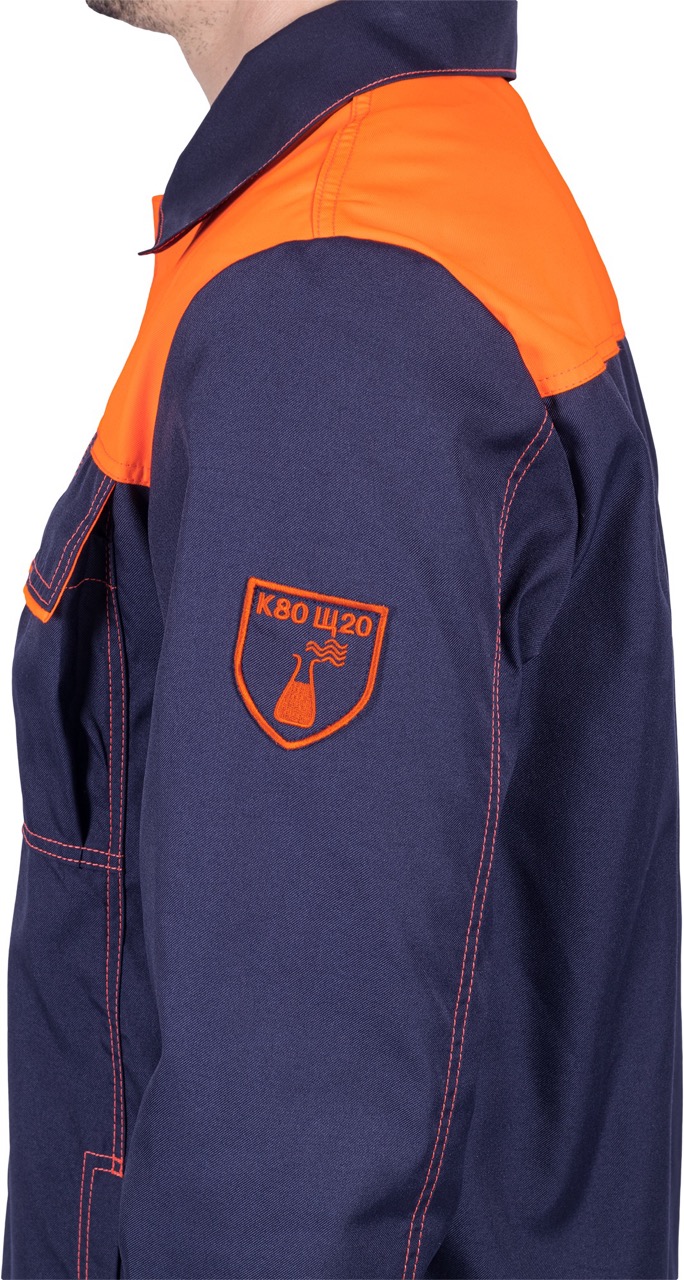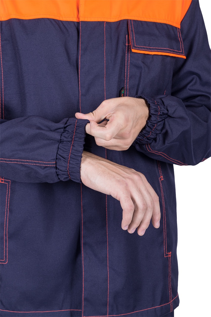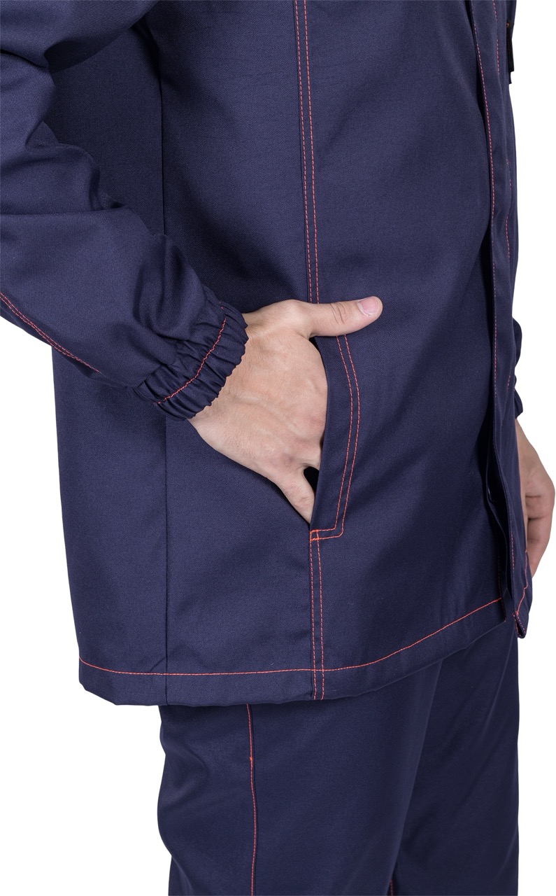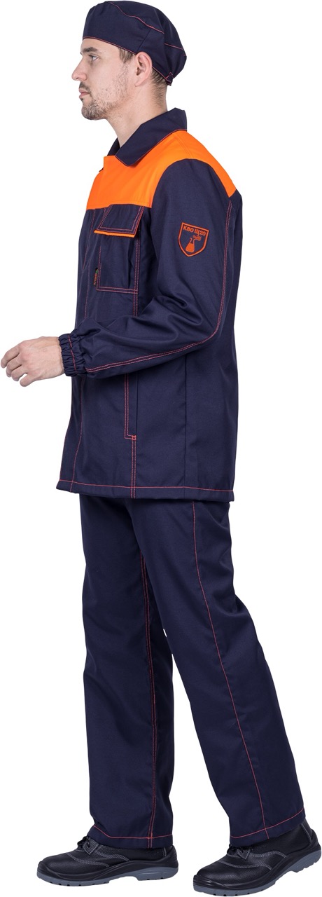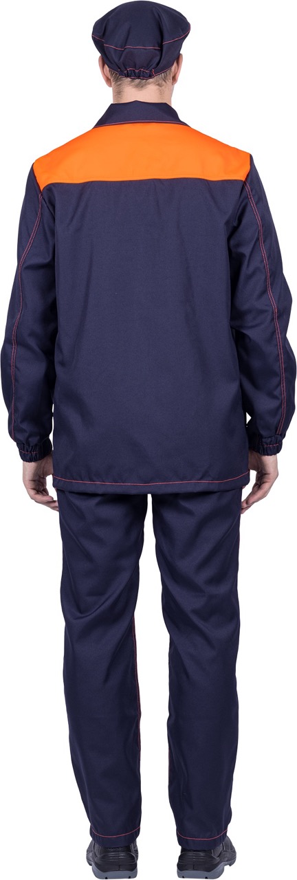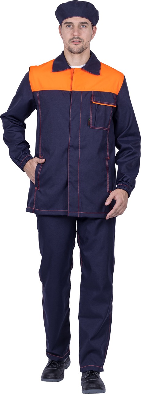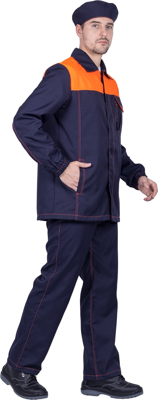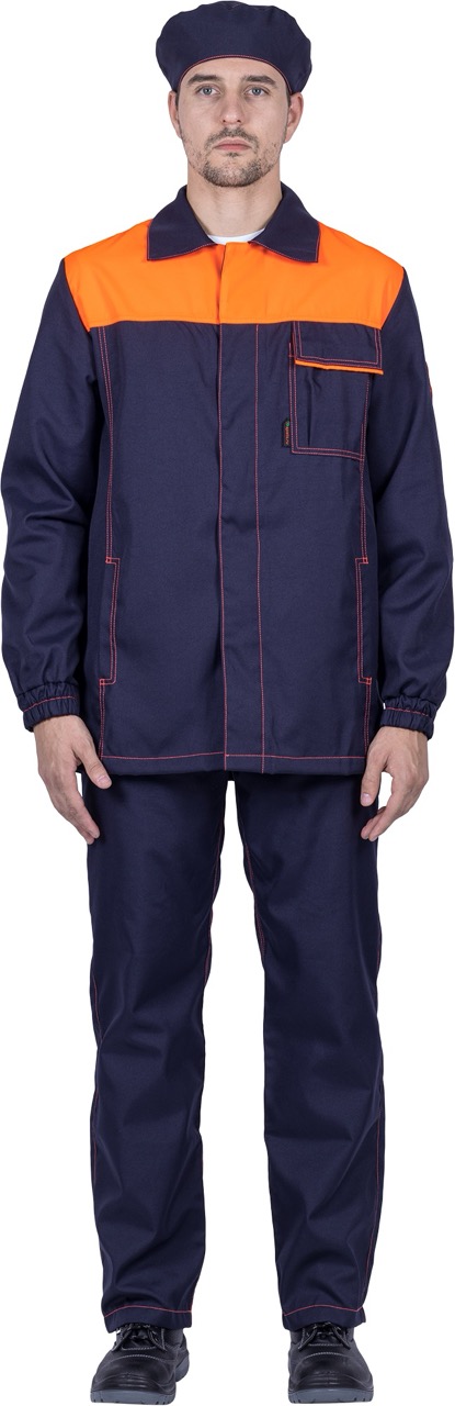 Комплект состоит из куртки, брюк и берета, выполненных в практичной и стильной расцветке — тёмно-синий с оранжевыми вставками и контрастной отделочной строчкой.