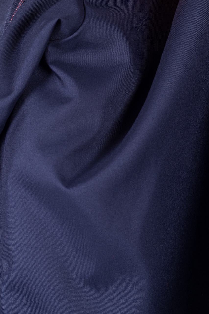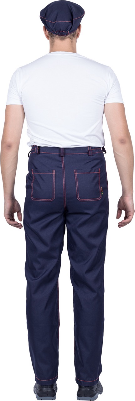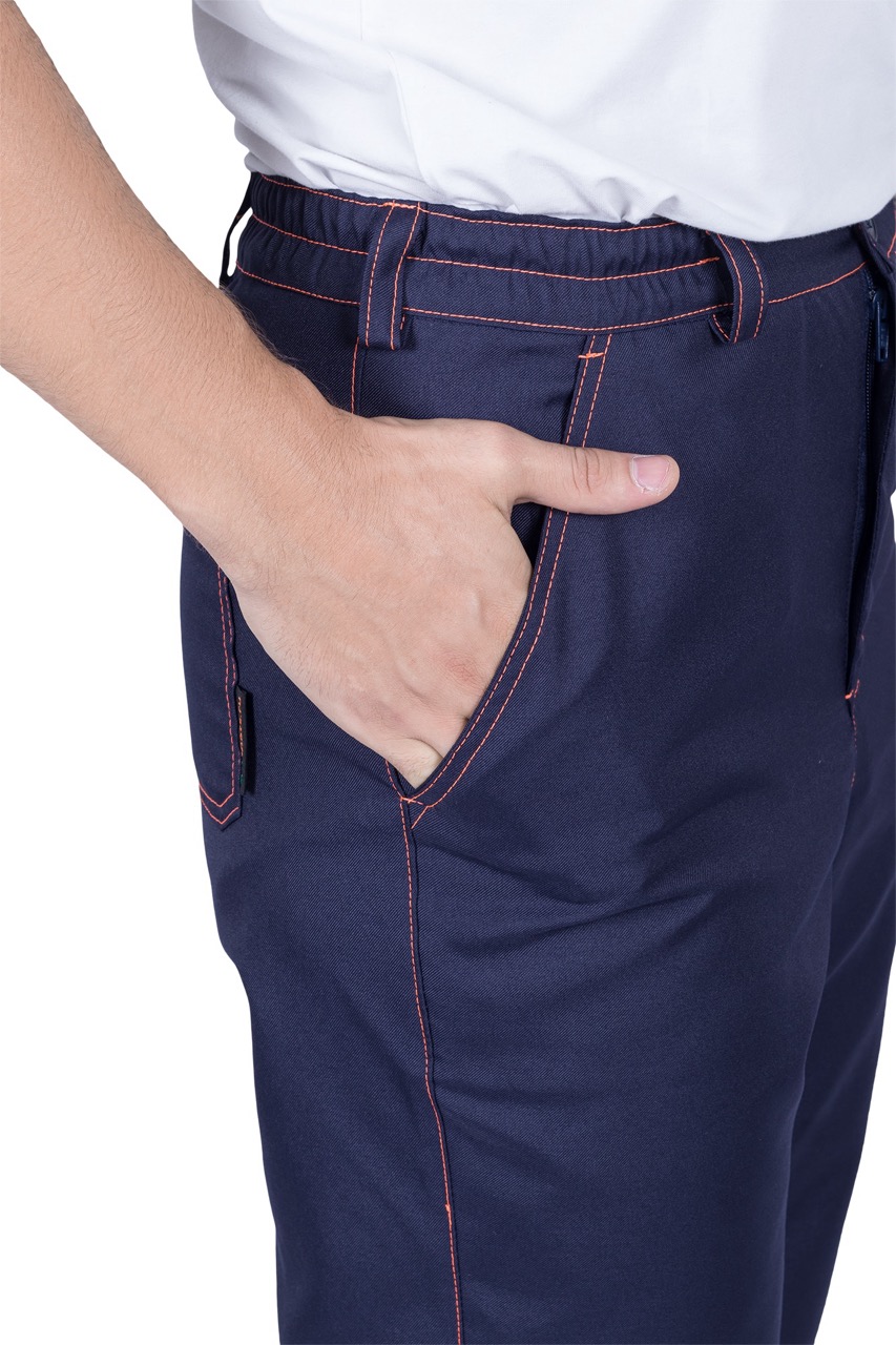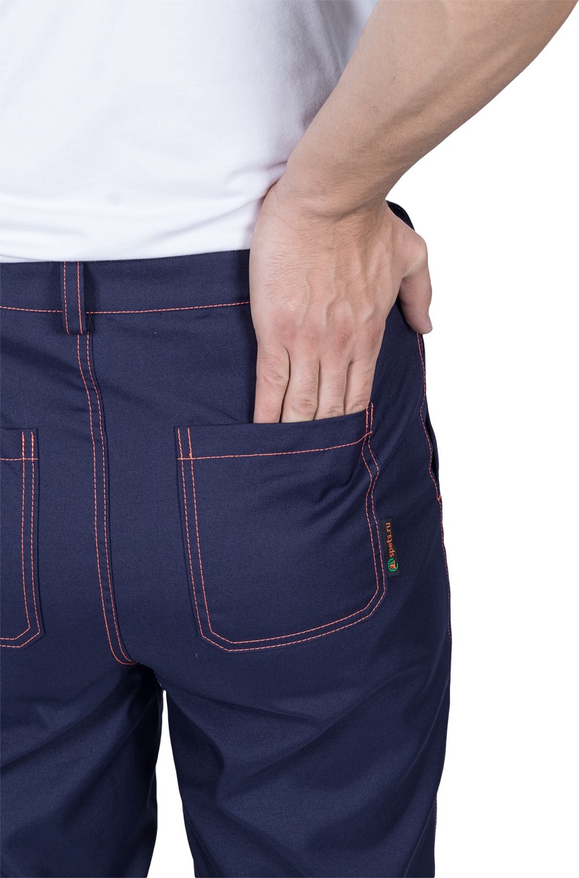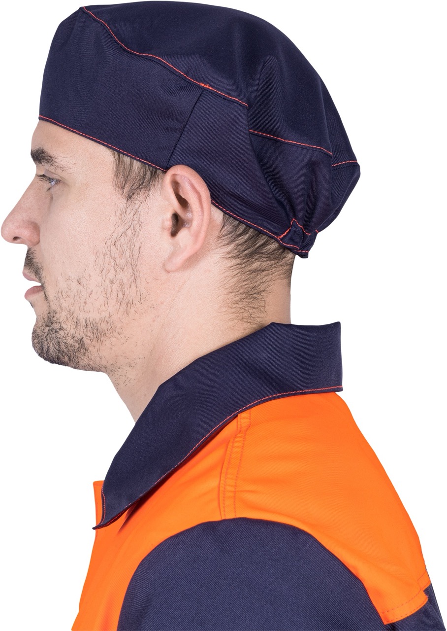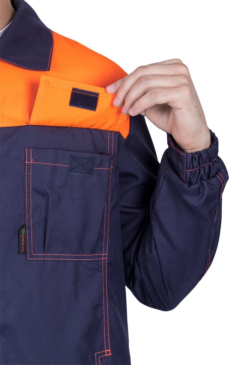 Комплект состоит из куртки, брюк и берета, выполненных в практичной и стильной расцветке — тёмно-синий с оранжевыми вставками и контрастной отделочной строчкой.