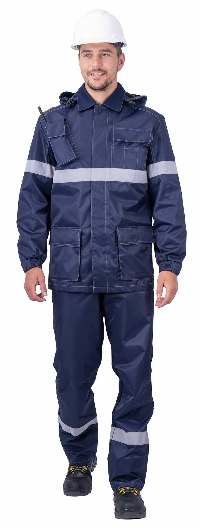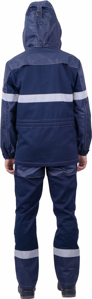 Комплект включает куртку и полукомбинезон, в конструкции предусмотрены световозвращающие полосы шириной 50 мм, улучшающие заметность работника при низкой видимости.