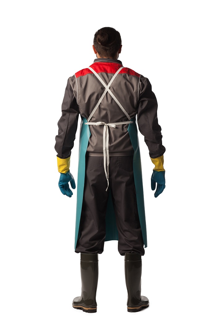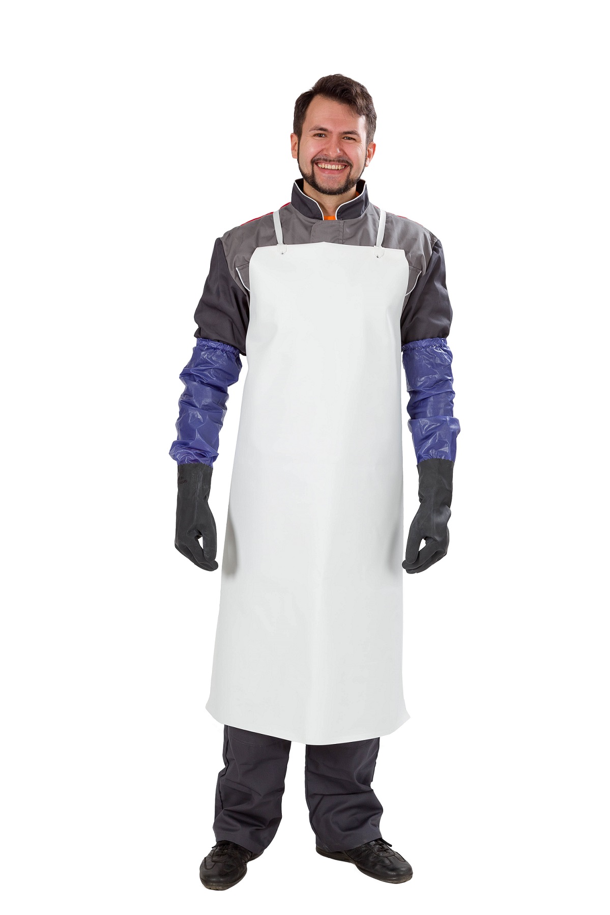 Прочный износоустойчивый фартук из уплотненного поливинилхлорида (ПВХ) предназначен для защиты от брызг кислот и щелочей концентрации до 80%, продуктов нефтепереработки, масел, жиров, лаков и красок на их основе при выполнении средних и тяжелых работ.