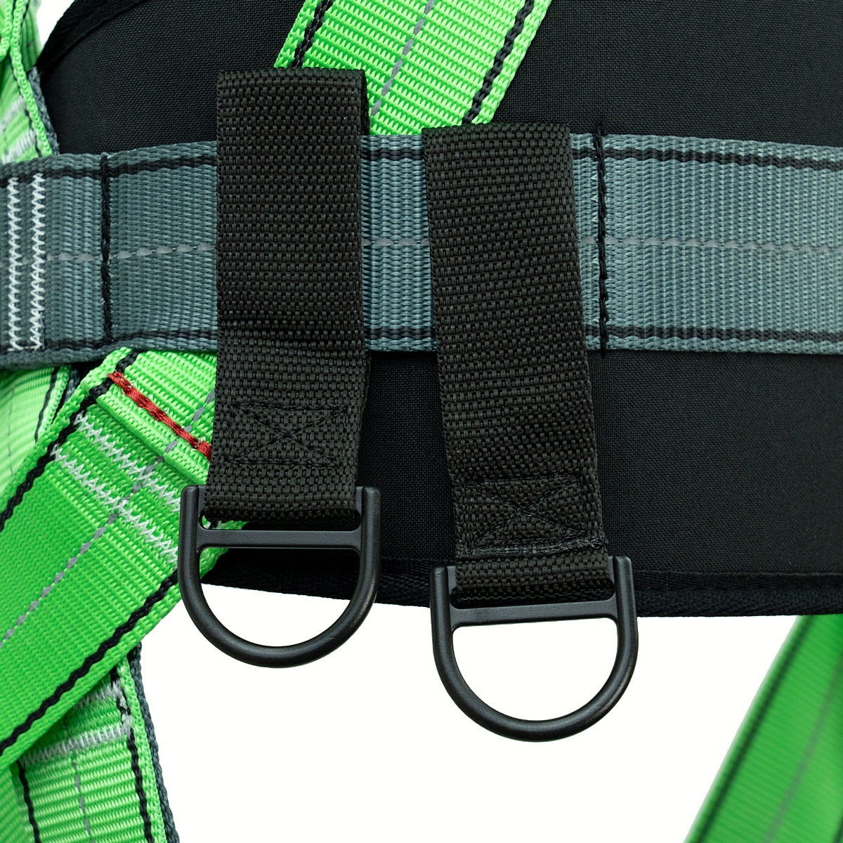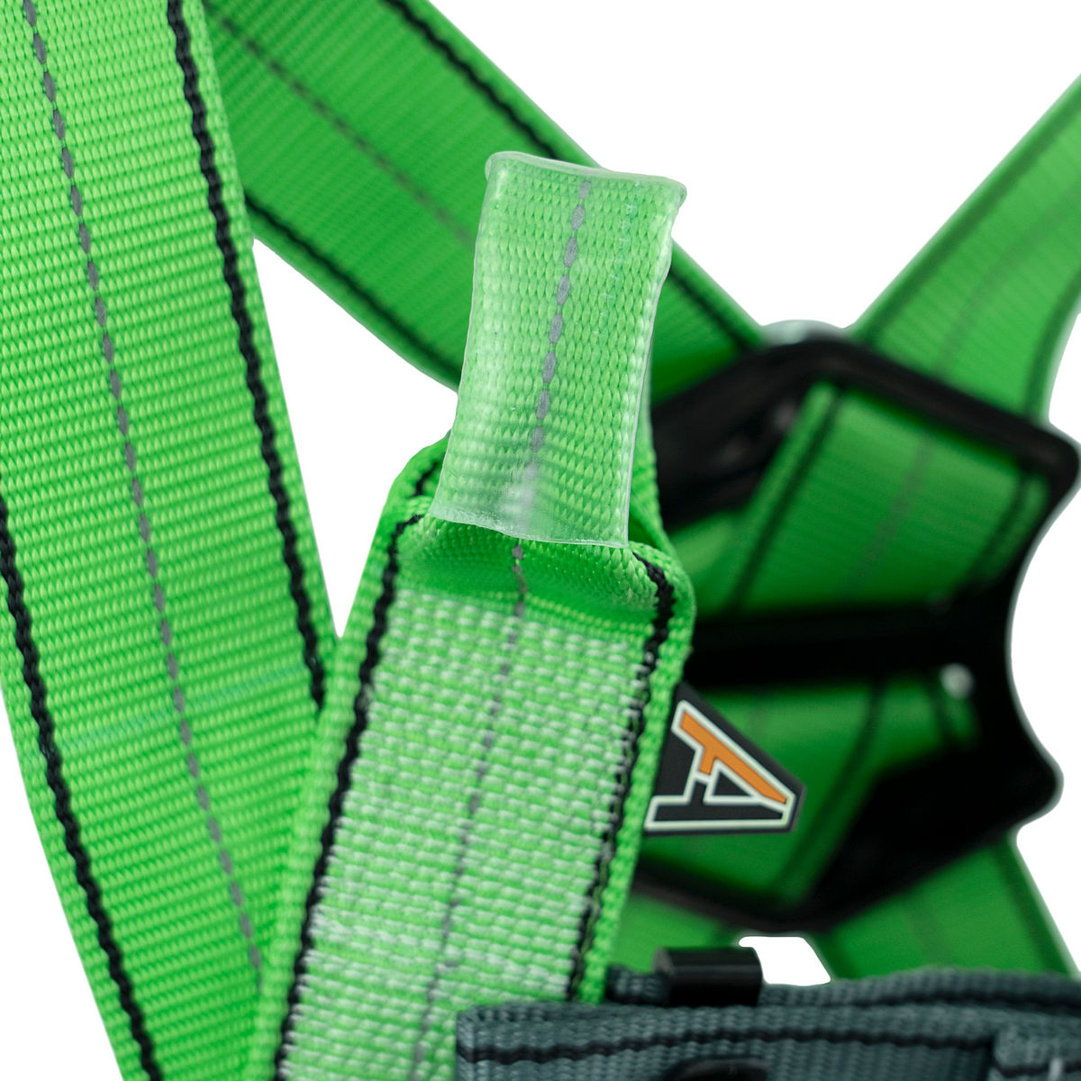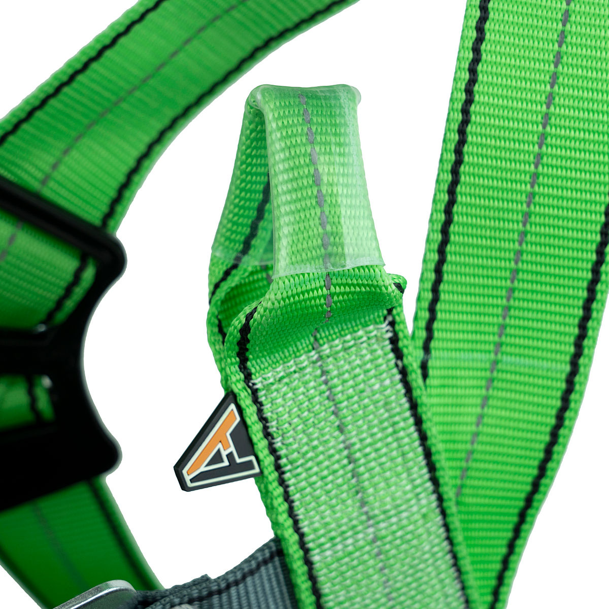 - Разный цвет лямок для идентификации верха и низа привязи (зеленый с СВ нитью - верх привязи, серый - её низ);