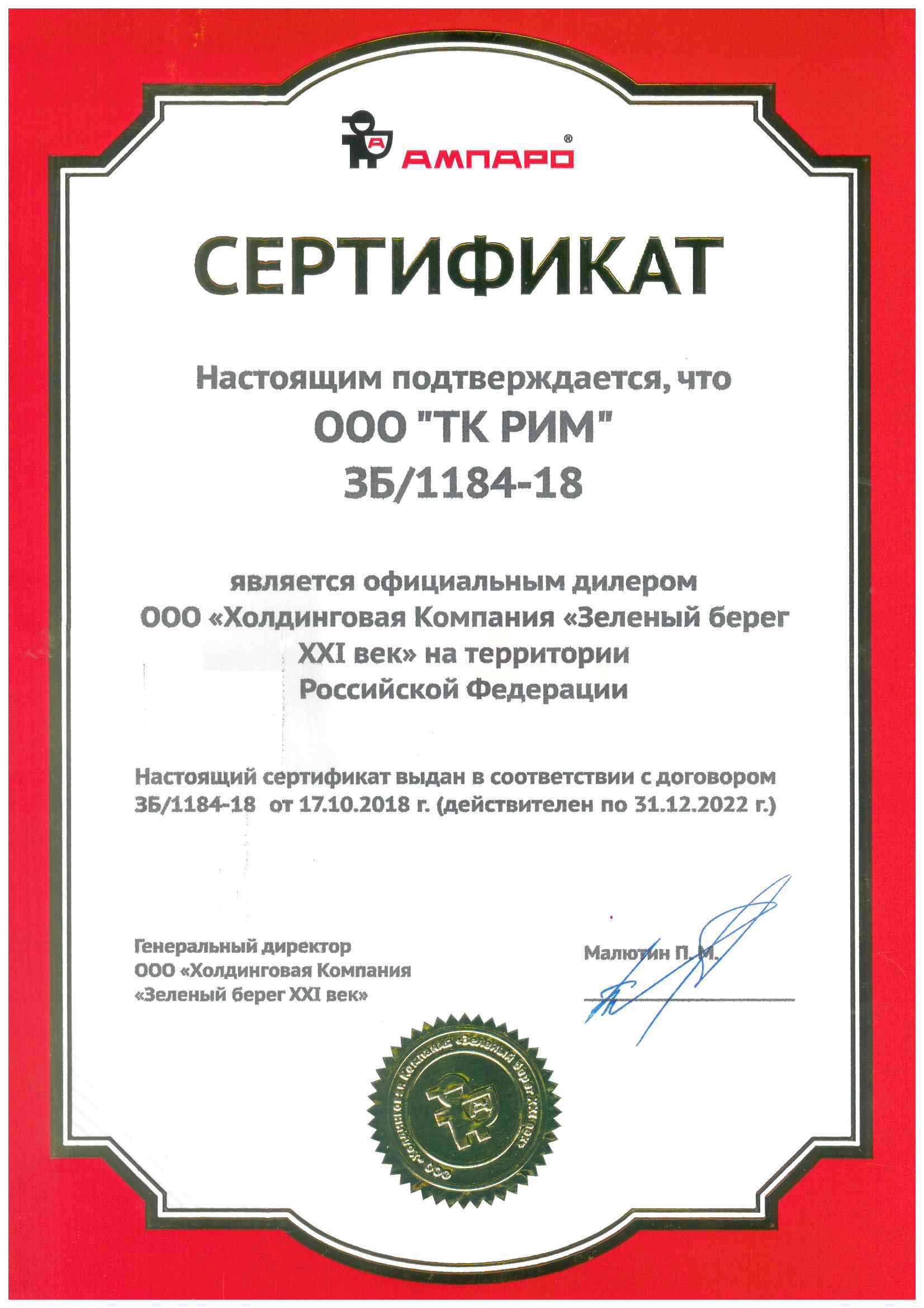 Сертификат от ООО "Холдинговая Компания "Зеленый берег XXI век" о том, что наша компания является официальным диллером на территории РФ