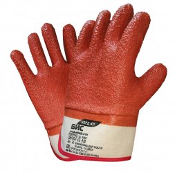 Перчатки Бис Норд КП с полным покрытием из эластичного морозостойкого поливинилхлорида (ПВХ) оранжевого цвета и манжетой в виде жесткой краги.